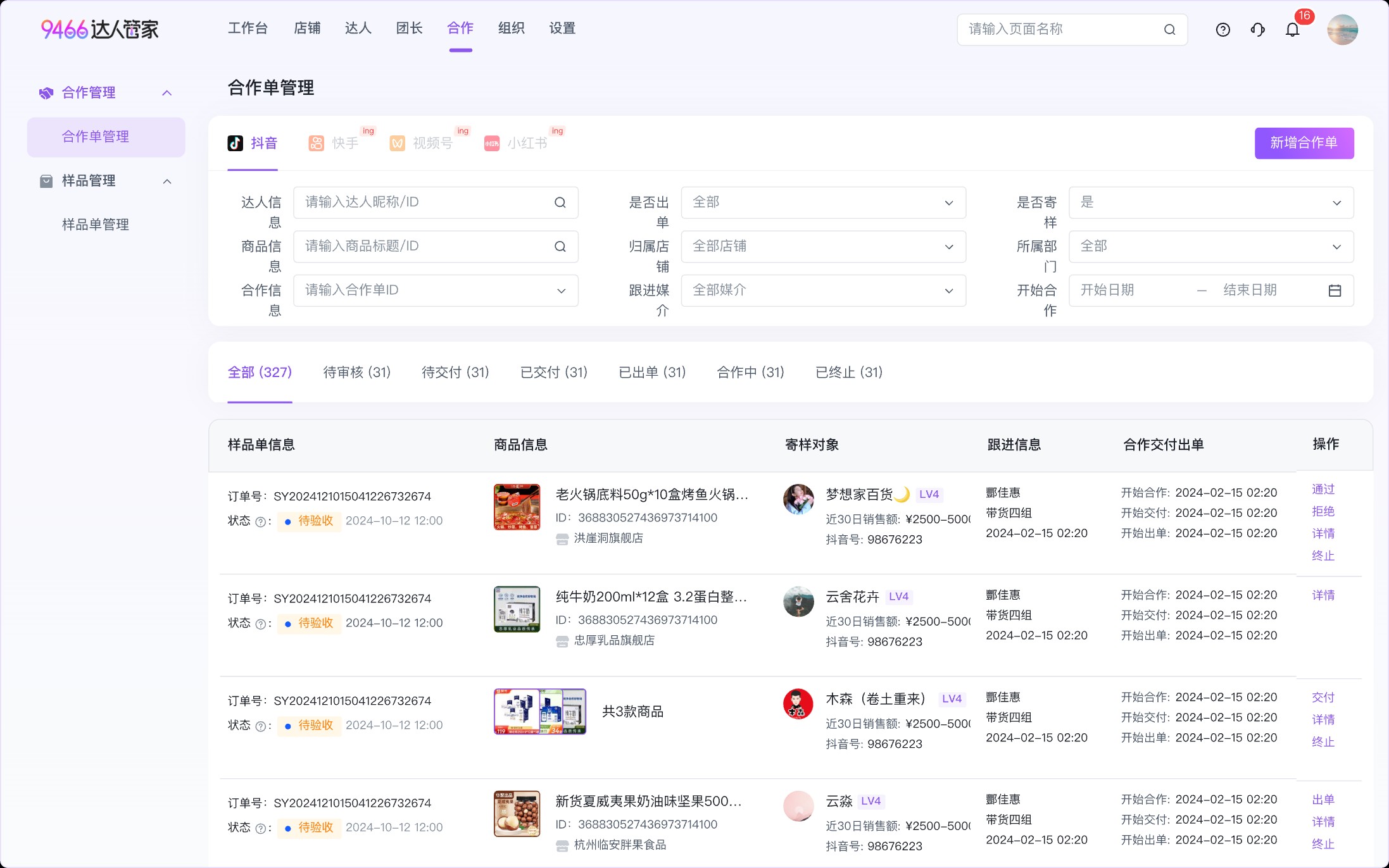 9466达人管家,智能化一站式达人营销管理平台,坐拥全网数千万能带货能种草的优质达人资源,让达人匹配快速精准,达人分配自由掌控,达人合作全程跟踪,运营决策有数可依,极大程度提升企业达人营销的业务规模和运营效能。